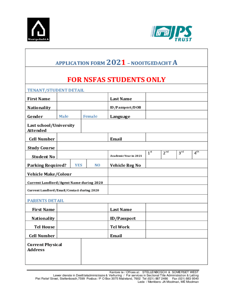 APPLICATION FORM 2021 NOOITGEDACHT FOR SEAS STUDENTS ONLY TENANT/STUDENT DETAIL First Nameless NameNationalityID/Passport/DOBGenderMaleFemaleLanguageLast school/University Attended Cell NumberEmailStudy