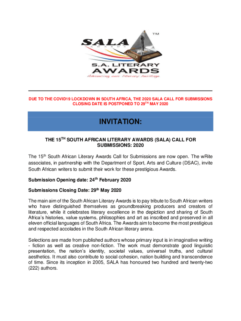 DUE TO THE COVID-19 LOCKDOWN IN SOUTH AFRICA, THE 2020 SALE CALL FOR SUBMISSIONS CLOSING DATE IS POSTPONED TO 29TH MAY 2020INVITATION: THE 15TH SOUTH AFRICAN LITERARY AWARDS (SALE) CALL FOR SUBMISSIONS: