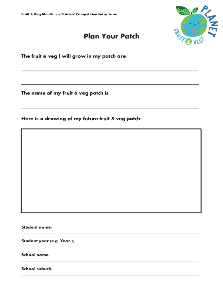 Fruit & Veg Month 2020 Student Competition Entry Formula Your Patch The fruit & veg I will grow in my patch are: The name of my fruit & veg patch is: Here is a drawing of my future fruit & veg patch:Student