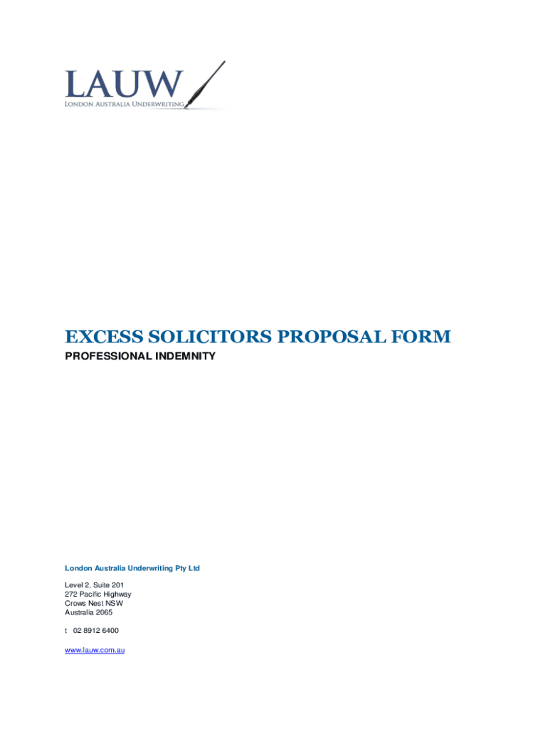 EXCESS SOLICITORS PROPOSAL FORM PROFESSIONAL INDEMNITY London Australia Underwriting Pty Ltd Level 2, Suite 201 272 Pacific Highway Crows Nest NSW Australia 2065 t 02 8912 6400 www.lauw.com.au IMPORTANT