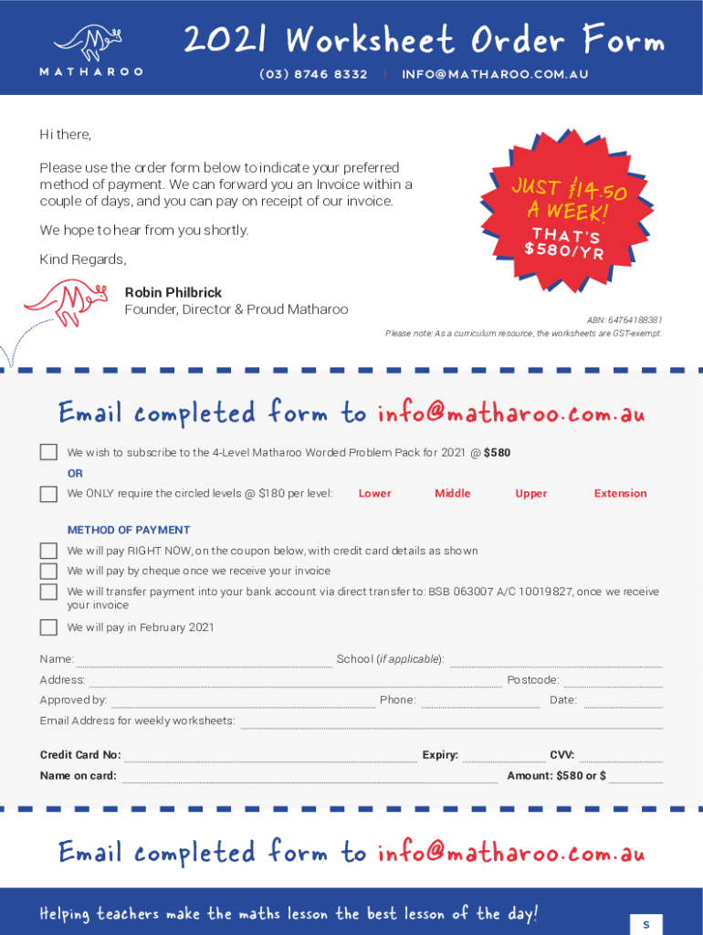 2021 Worksheet Order Form (03) 8746 8332 info matharoo.com. Audi there, Please use the order form below to indicate your preferred method of payment. We can forward you an Invoice within a couple