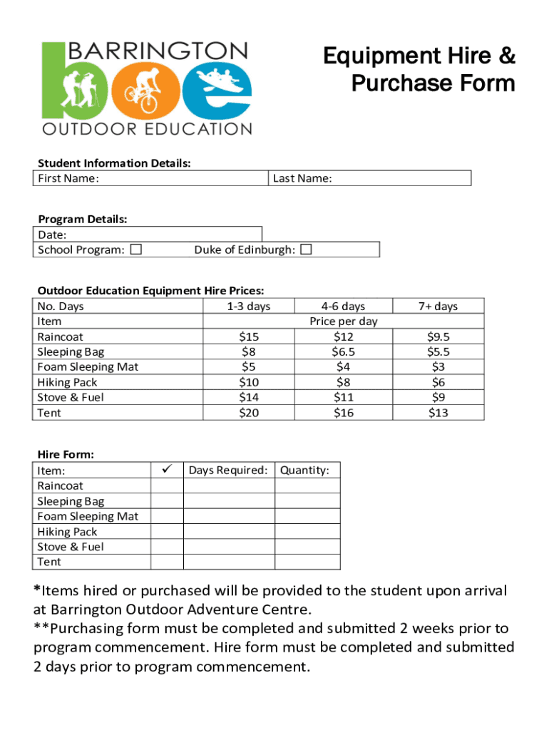 Equipment Hire & Purchase FormStudent Information Details: First Name: Program Details: Date: School Program:Last Name:Duke of Edinburgh:Outdoor Education Equipment Hire Prices: No. Days 13 days Item