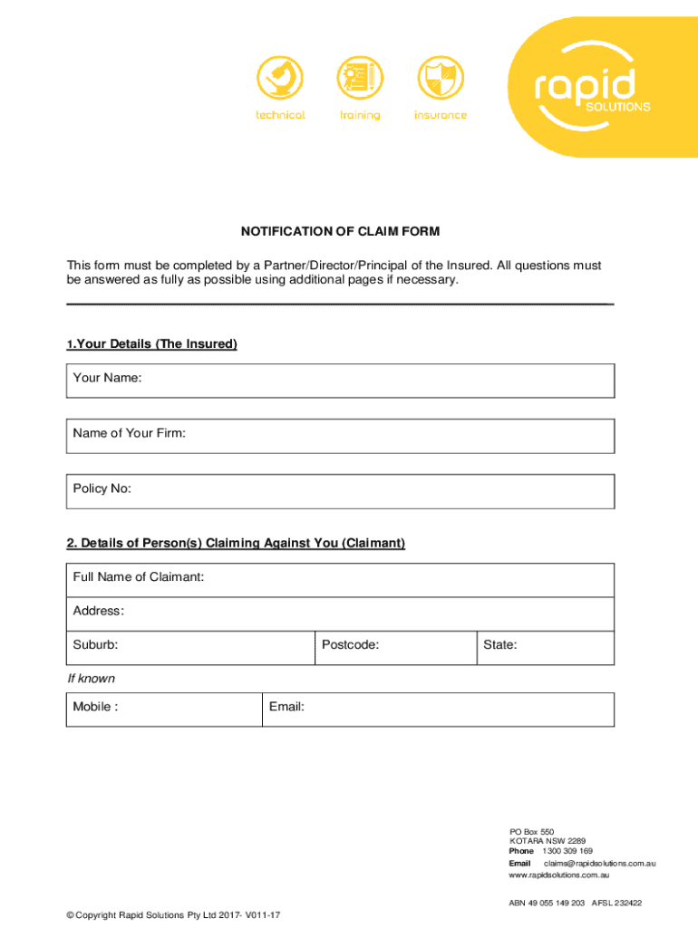 NOTIFICATION OF CLAIM From This form must be completed by a Partner/Director/Principal of the Insured. All questions must be answered as fully as possible using additional pages if necessary. 1. Your