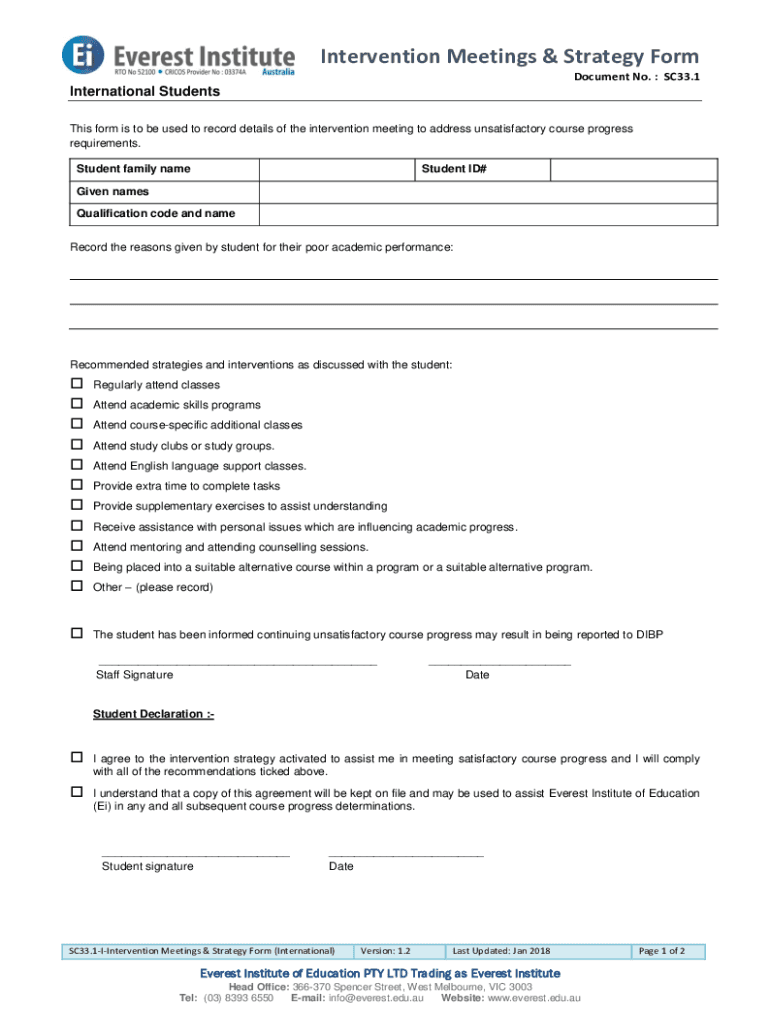 Intervention Meetings & Strategy Form Document No. SC33.1International Students This form is to be used to record details of the intervention meeting to address unsatisfactory course progress requirements.
