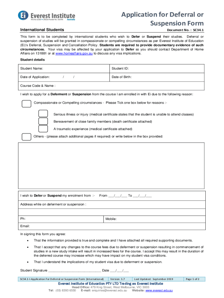 International StudentsDocument No. SC34.1This form is to be completed by international students who wish to Defer or Suspend their studies. Deferral or