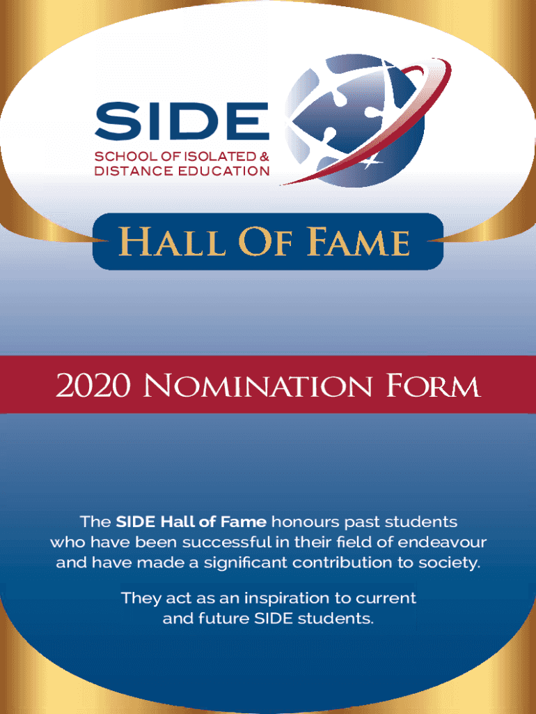 PRESCHOOL OF ISOLATED & DISTANCE EDUCATION2020 NOMINATION The SIDE Hall of Fame honors past students who have been successful in their field of endeavor and have made a significant contribution to