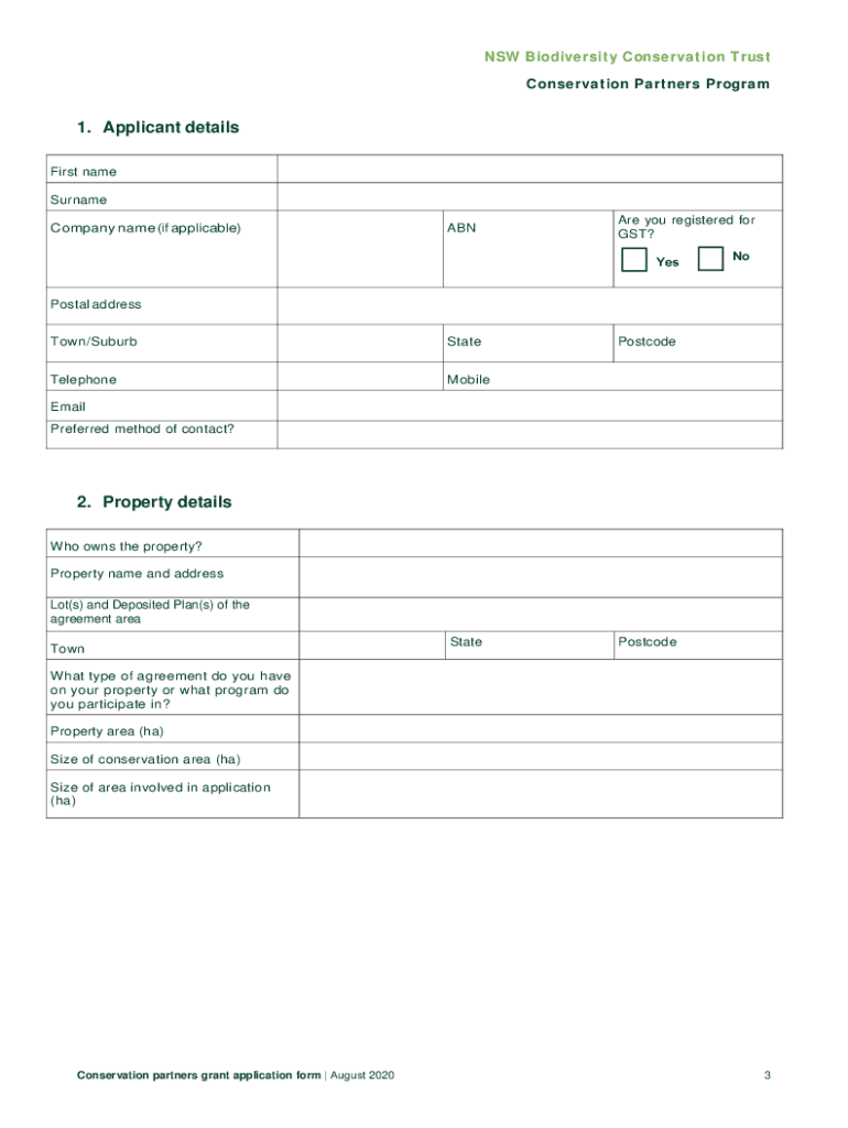 Biodiversity Conservation Trust Conservation Partners Grant Application Form August 2020NSW Biodiversity Conservation Trust Conservation Partners ProgramConservation partners grant application form
