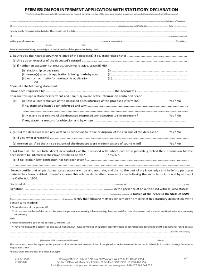 PERMISSION FOR INTERMENT APPLICATION WITH STATUTORY DECLARATION(This form should be completed by an executor or nearest surviving relative of the deceased or other proper person, and all questions