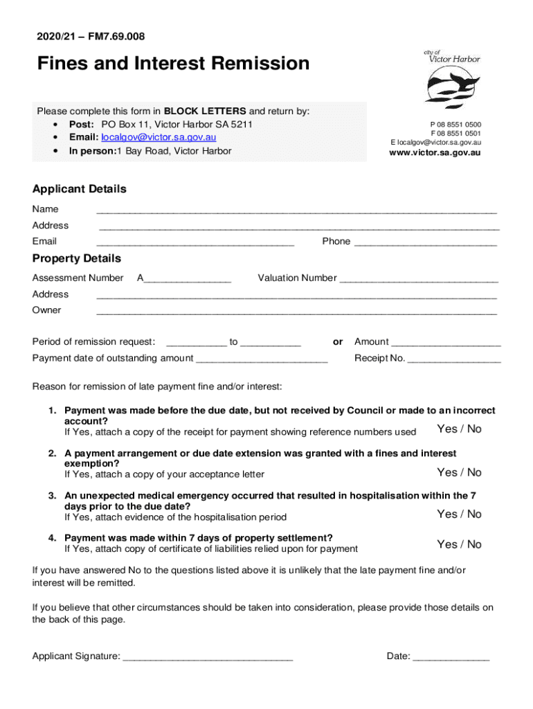 2020/21 FM7.69.008Fines and Interest Remission Please complete this form in BLOCK LETTERS and return by: Post: PO Box 11, Victor Harbor SA 5211 Email: local gov victor.SA.gov.AU In person:1 Bay Road,