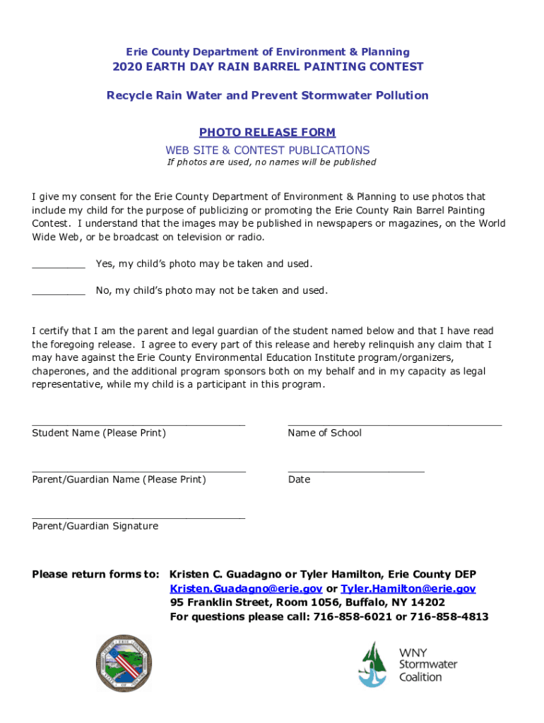 Erie County Department of Environment & Planning2020 EARTH DAY RAIN BARREL PAINTING CONTEST Recycle Rain Water and Prevent Stormwater Pollution PHOTO RELEASE FORM Website & CONTEST PUBLICATIONS If