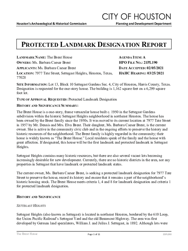 Houston's Archaeological & Historical Commission CITY OF HOUSTON Planning and Development DepartmentPROTECTED LANDMARK DESIGNATION REPORT LANDMARK NAME: The Brent House OWNERS: Ms. Barbara Caesar