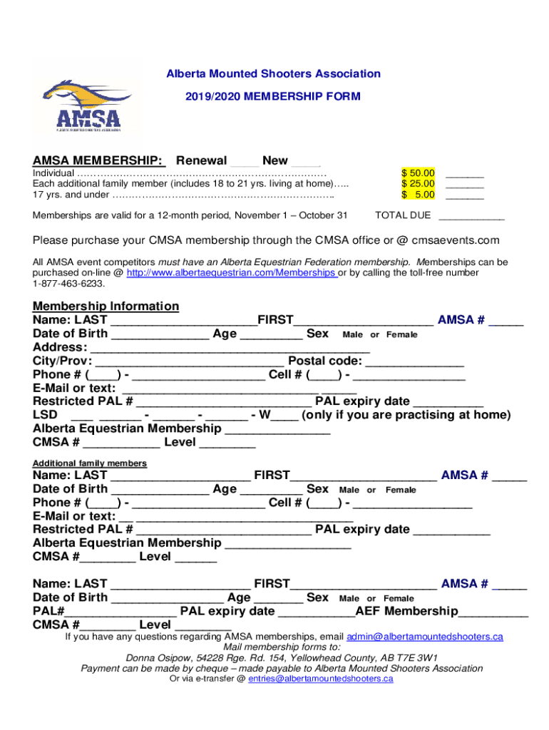 Alberta Mounted Shooters Association 2019/2020 MEMBERSHIP FORMATS MEMBERSHIP:Renewal New Individual. Each additional family member (includes 18 to 21 yrs. Living at home). 17 yrs. And under. Memberships