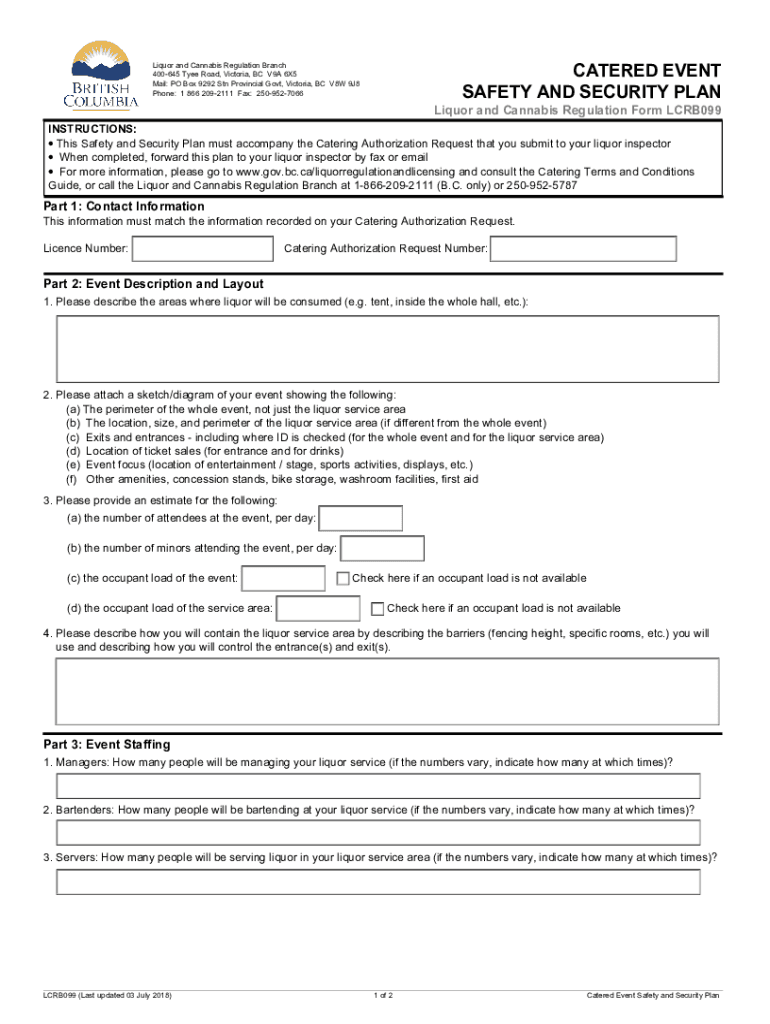 CATERED EVENT SAFETY AND SECURITY PLANLiquor and Cannabis Regulation Branch 400645 The Road, Victoria, BC V9A 6×5 Mail: PO Box 9292 STN Provincial Govt, Victoria, BC V8W 9J8 Phone: 1 866 2092111
