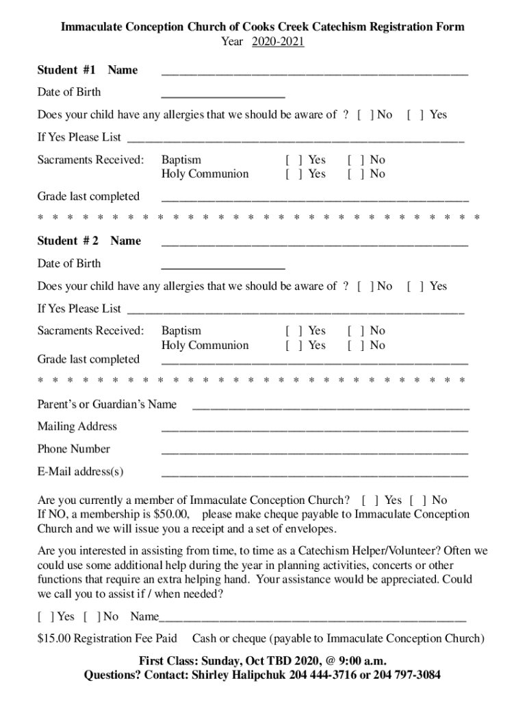 Immaculate Conception Church of Cooks Creek Catechism Registration Form Year 20202021 Student #1 Name Date of Birth Does your child have any allergies that we should be aware of ? No CESIF Yes Please