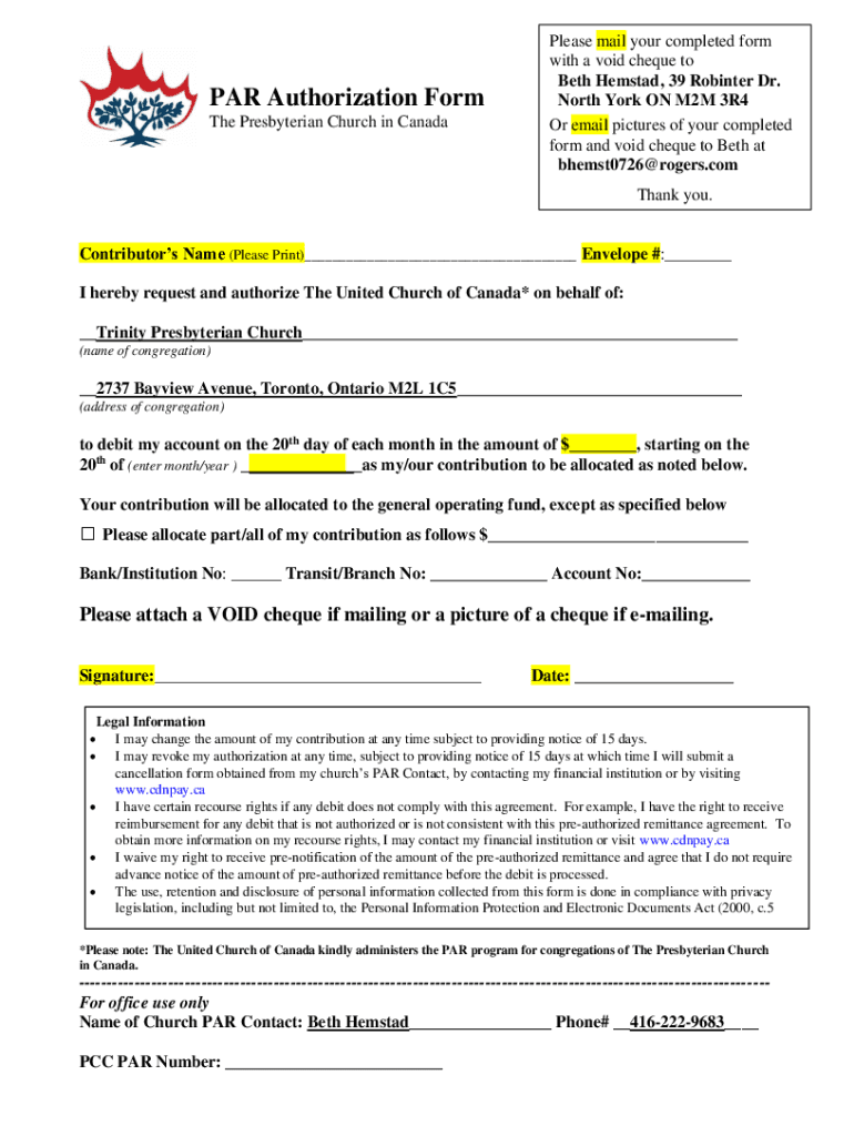PAR Authorization Form The Presbyterian Church in CanadaPlease mail your completed form with a void check to Beth Hems tad, 39 Rob inter Dr. North York ON M2M 3R4 Or email pictures of your completed