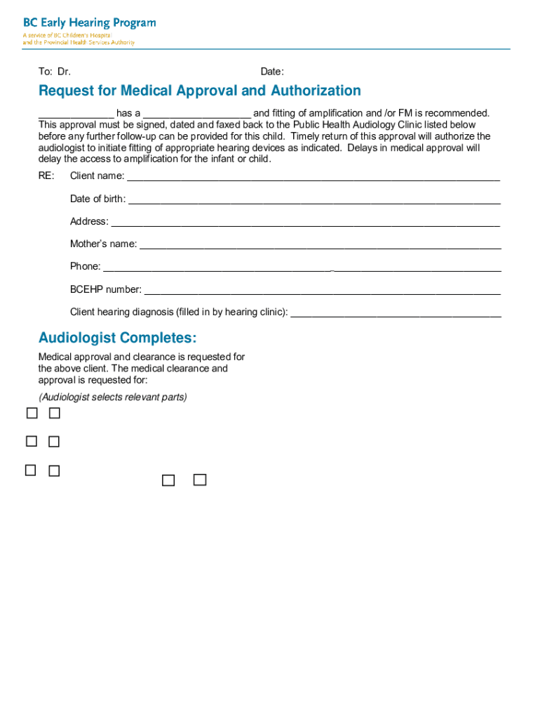 To: Dr. Date:Request for Medical Approval and Authorization has a and fitting of amplification and /or FM is recommended. This approval must be signed, dated and faxed back to the Public Health Audiology