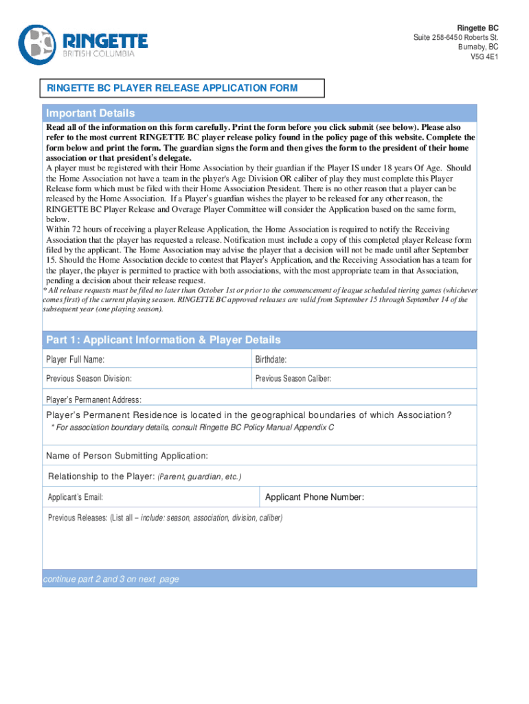 V5G 4E1RINGETTE BC PLAYER RELEASE APPLICATION FORMImportant Details