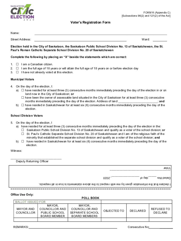 FORM R (Appendix C) Subsections 96(2) and 121(2) of the Act Voters Registration Form Name: Street Address:Ward:Election held in the City of Saskatoon, the Saskatoon Public School Division No. 13 of