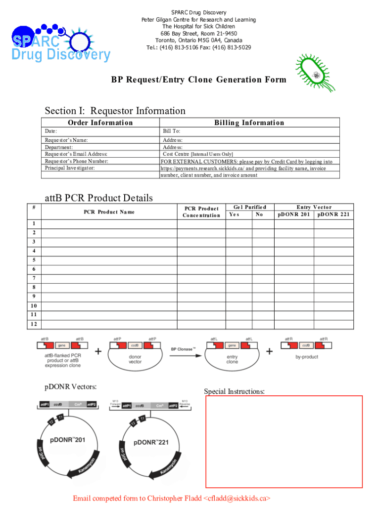 SPARC Entry CloneBP request is a form used to request entry of novel DNA sequences into the SPARC database.