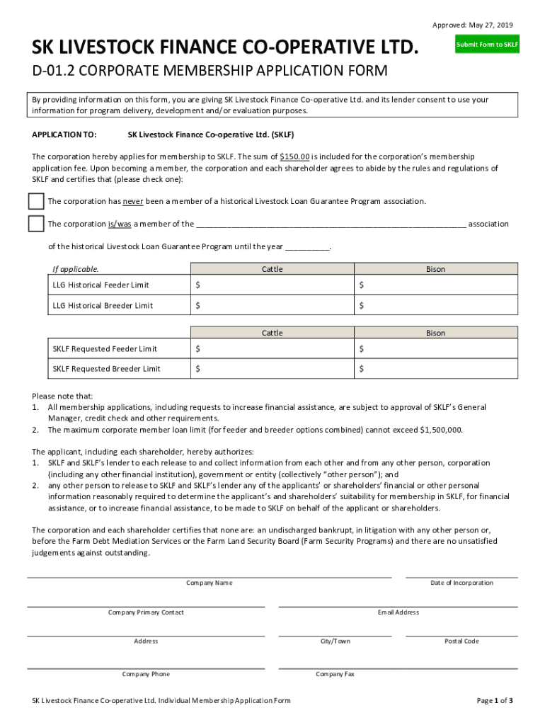 Approved: May 27, 2019SK LIVESTOCK FINANCE COOPERATIVE LTD. Submit Form to SKLFD01.2 CORPORATE MEMBERSHIP APPLICATION FORM