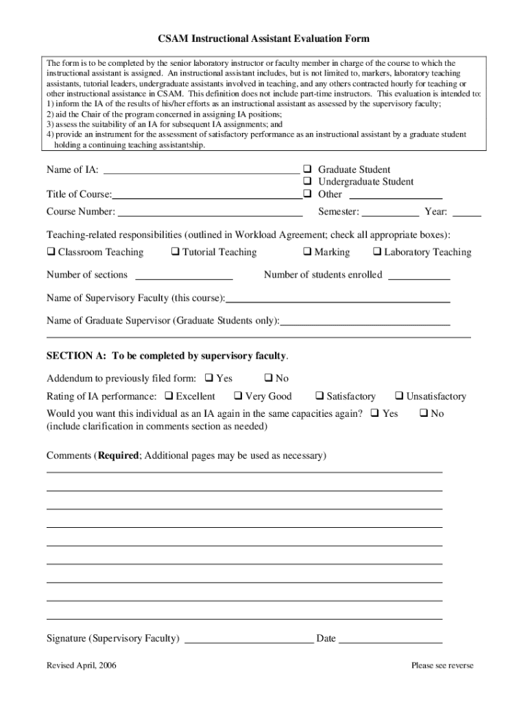 The form is to be completed by the senior laboratory instructor or faculty member in charge of the course to which the