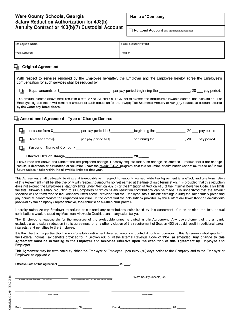 Ware County Schools, Georgia Salary Reduction Authorization for 403(b) Annuity Contract or 403(b)(7) Custodial Account Name of Company No Load Account (No agent signature Required) Employees Name