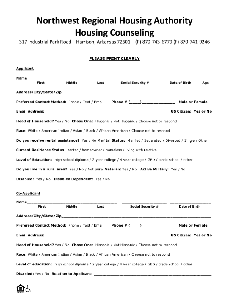 Northwest Regional Housing Authority Housing Counseling 317 Industrial Park Road Harrison, Arkansas 72601 (P) 8707436779 (F) 8707419246 PLEASE PRINT CLEARLY Applicant Name FirstMiddle Last Social