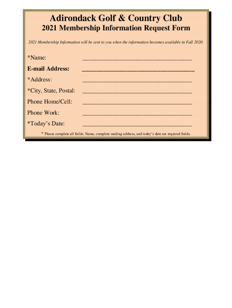 Adirondack Golf & Country Club 2021 Membership Information Request Form 2021 Membership Information will be sent to you when the information becomes available in Fall 2020.×Name: Email Address: *Address: