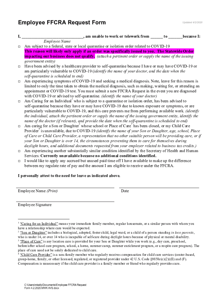 Employee FF CRA Request Formulated 4/2/2020I, am unable to work or telework from to because I: Employee Name Am subject to a federal, state or local quarantine or isolation order related to COVID-19