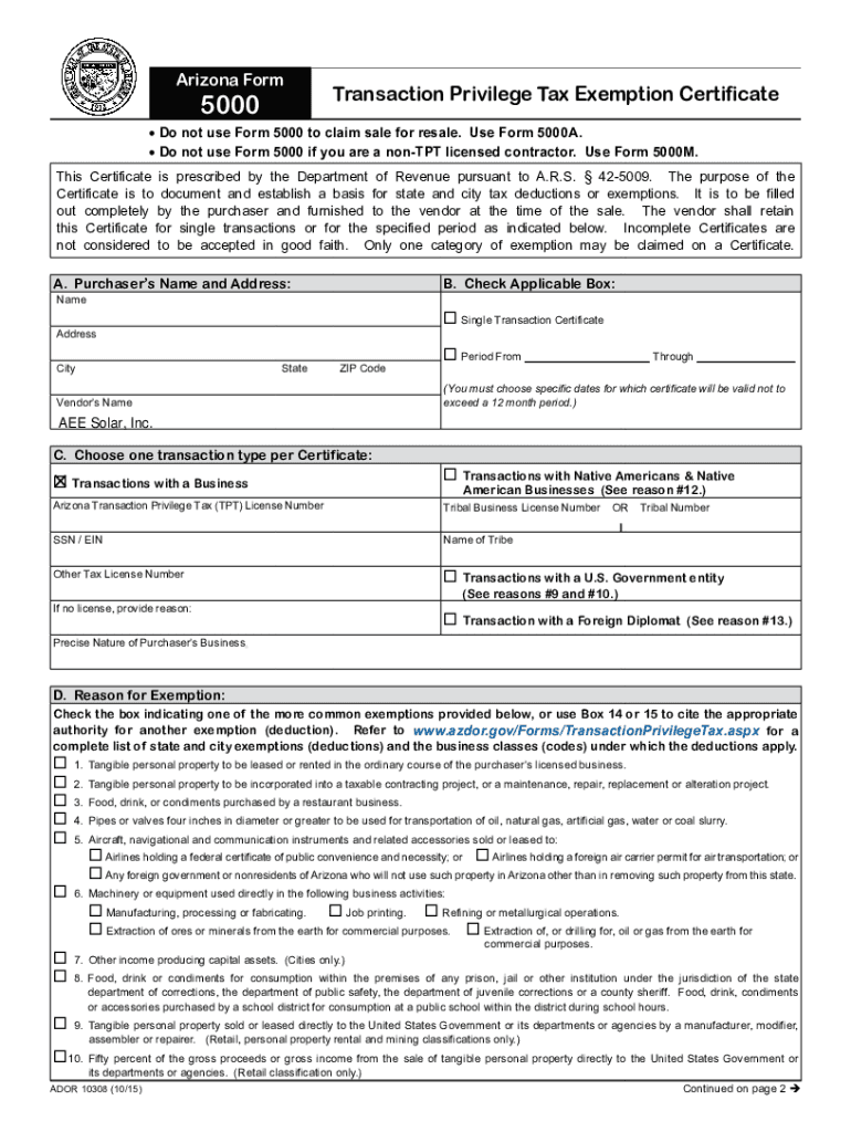 Arizona Form5000Transaction Privilege Tax Exemption Certificate Do not use Form 5000 to claim sale for resale. Use Form 5000A. Do not use Form 5000 if you are a nonTPT licensed contractor. Use Form