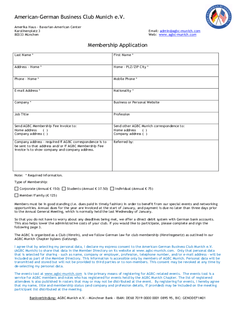 American German Business Club Munich e.V. America Has Bavarian American Center Karolinenplatz 3 80333 Archenemies: admin agbcmunich.com Web: www.agbcmunich.comMembership Application Last Name *First