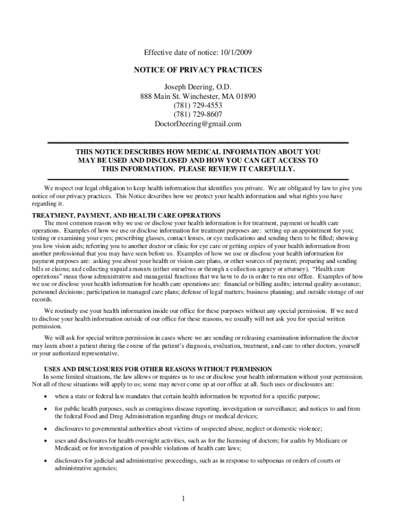 Effective date of notice: 10/1/2009 NOTICE OF PRIVACY PRACTICES Joseph Deeming, O.D. 888 Main St. Winchester, MA 01890 (781) 7294553 (781) 7298607 DoctorDeering gmail.com THIS NOTICE DESCRIBES HOW