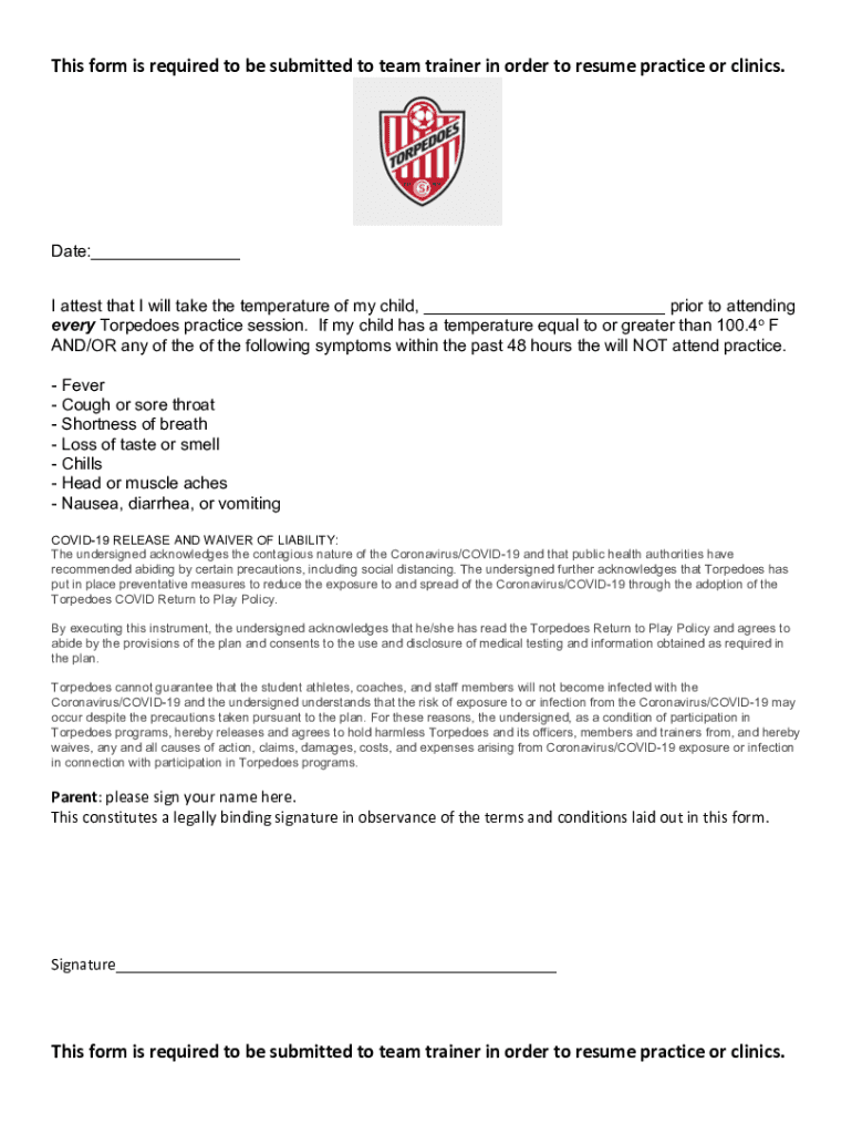This form is required to be submitted to team trainer in order to resume practice or clinics. Date: I attest that I will take the temperature of my child, prior to attending every Torpedo's practice