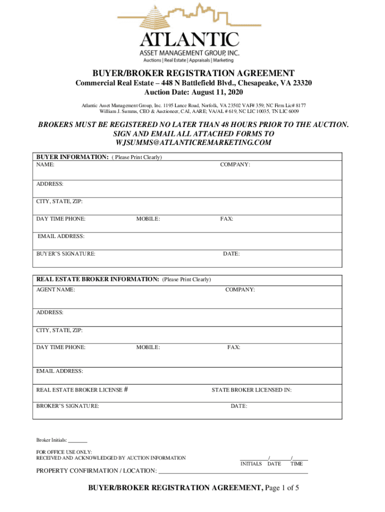 BUYER/BROKER REGISTRATION AGREEMENT Commercial Real Estate 448 N Battlefield Blvd., Chesapeake, VA 23320 Auction Date: August 11, 2020, Atlantic Asset Management Group, Inc. 1195 Lance Road, Norfolk,