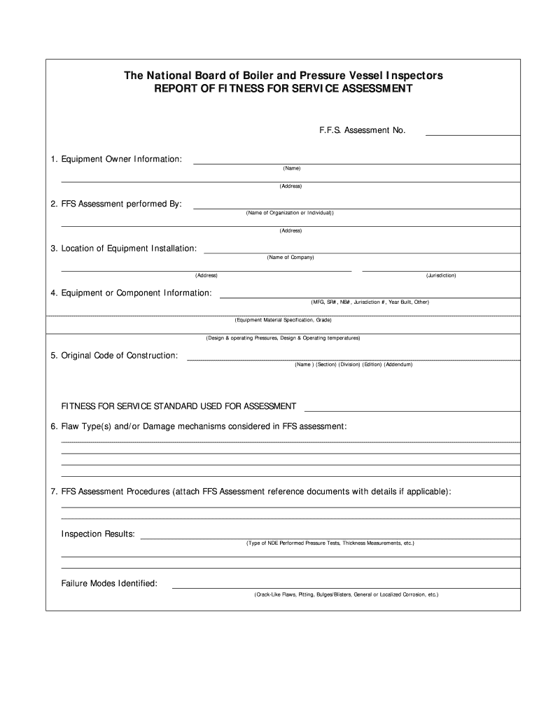 The Fitness for Service Assessment Report is a crucial document used in evaluating the integrity of equipment such as boilers and pressure vessels. This report serves to ascertain whether an asset can continue to operate safely and efficiently while adhering to industry standards. In order to validate its findings, the report must be signed by key stakeholders, including the owner, the responsible engineer, and an inspector to ensure accountability and compliance. This assessment plays a significant role in equipment integrity evaluation by identifying potential defects and assessing overall operational safety.
