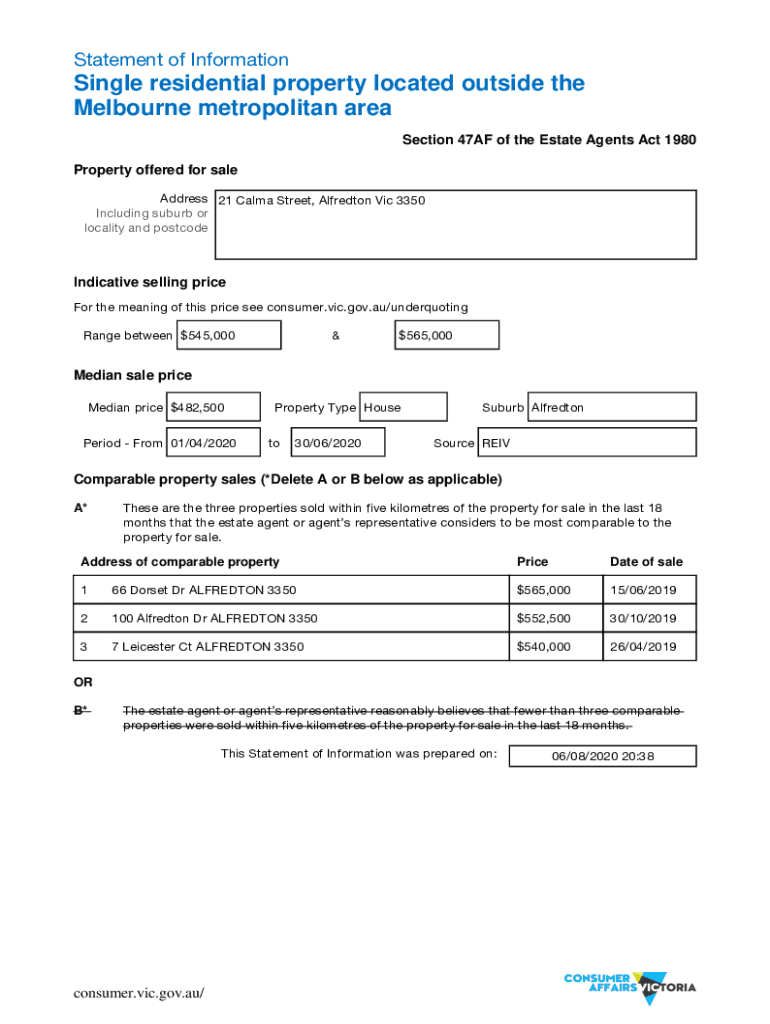 Statement of InformationSingle residential property located outside the Melbourne metropolitan area Section 47AF of the Estate Agents Act 1980 Property offered for sale Address 21 Calm Street, Alfred