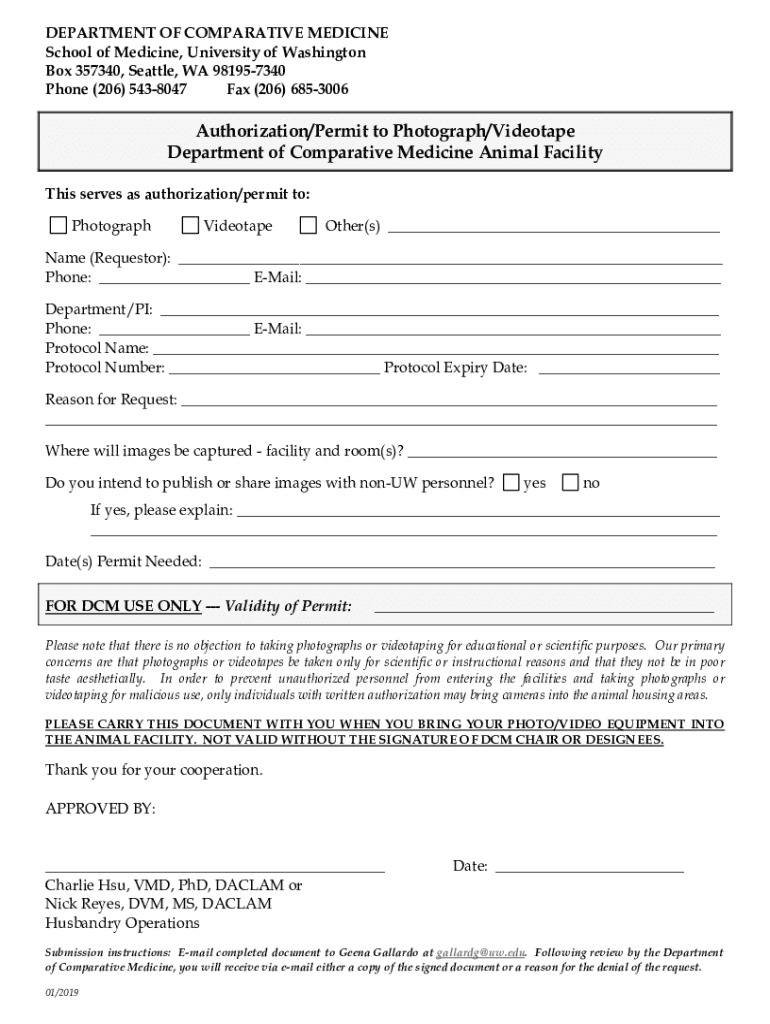 DEPARTMENT OF COMPARATIVE MEDICINE School of Medicine, University of Washington Box 357340, Seattle, WA 981957340 Phone (206) 5438047 Fax (206) 6853006Authorization/Permit photographing/Videotape