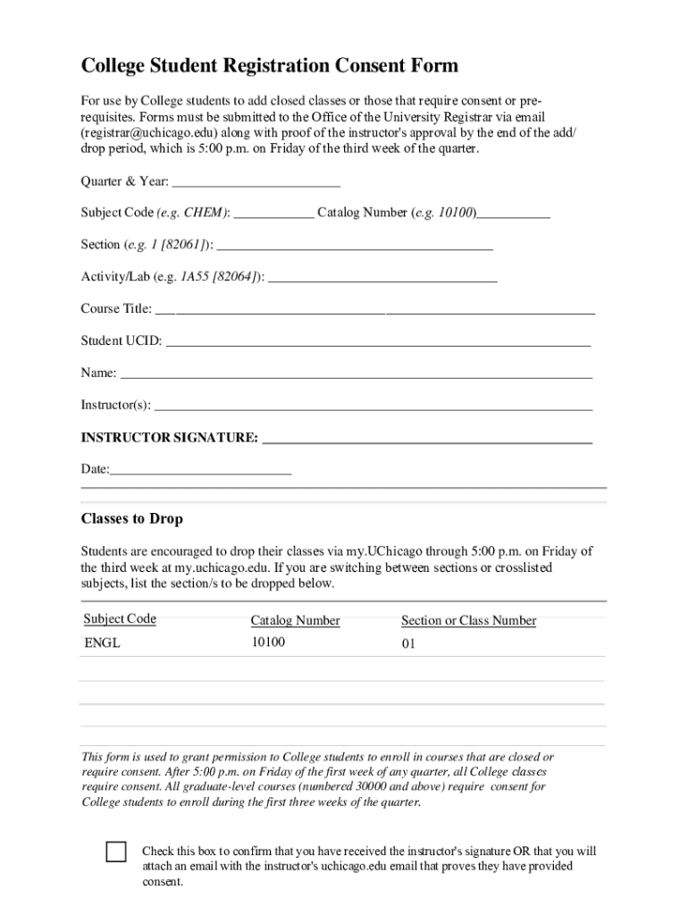 College Student Registration Consent Form For use by College students to add closed classes or those that require consent or prerequisites. Forms must be submitted to the Office of the University