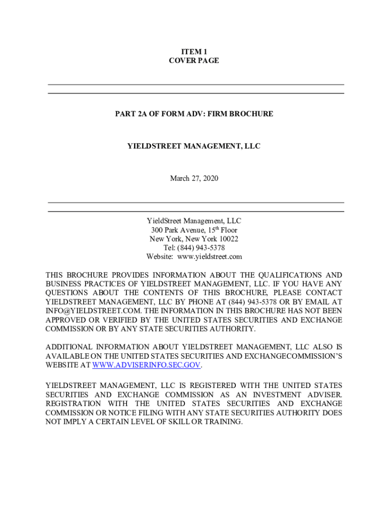 COVER PAGEANT 2A OF FORM ADV: FIRM BROCHUREYIELDSTREET MANAGEMENT, LLC March 27, 2020YieldStreet Management, LLC