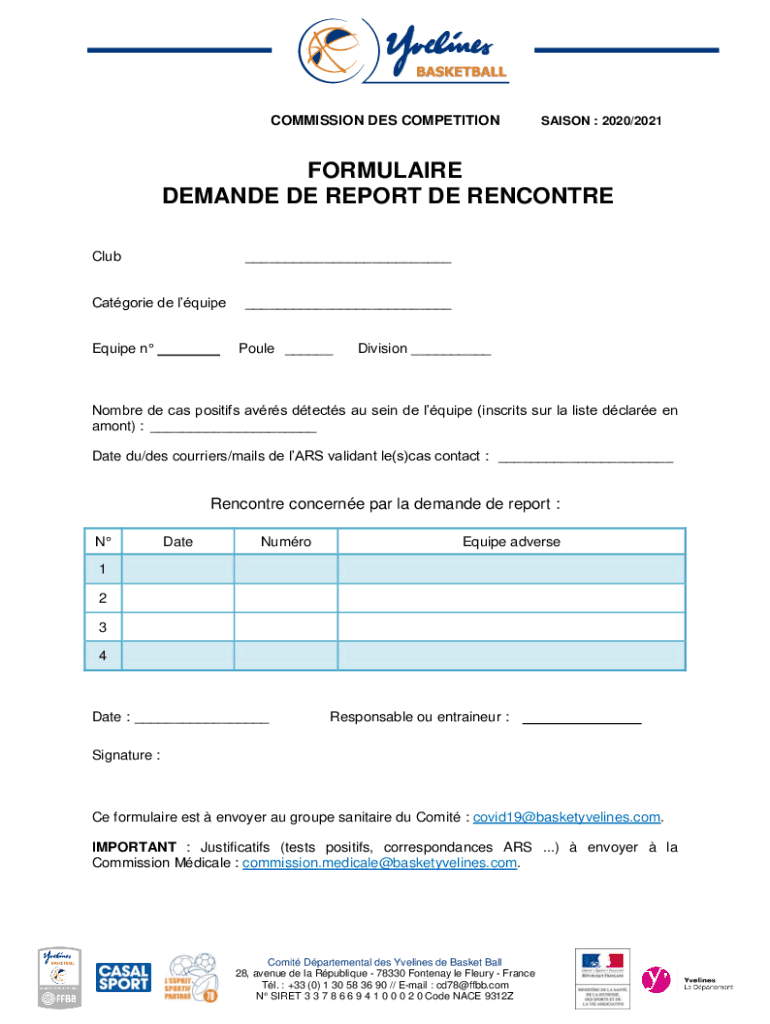 COMMISSION DES COMPETITIONSAISON : 2020/2021FORMULAIRE DEMAND DE REPORT DE ENCORE Club Categories DE quite Equip noble Division Hombre de CAS positives airs detects AU San de quite (inserts SUR la