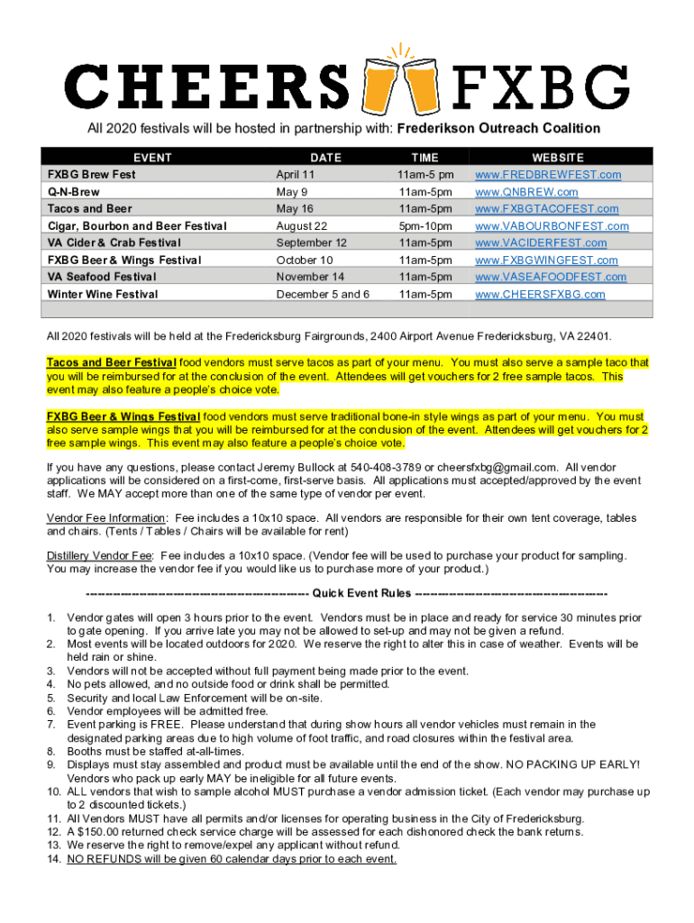 All 2020 festivals will be hosted in partnership with: Frederickson Outreach Coalition EVENT FBG Brew Fest Andrew Tacos and Beer Cigar, Bourbon and Beer Festival VA Cider & Crab Festival FBG Beer