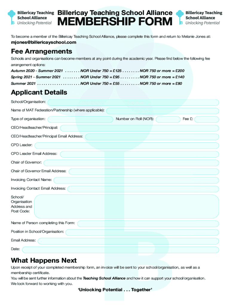 To fill out the Billericay Teaching School Alliance paperwork, schools and organizations must provide information about their staff, training programs, and goals for the coming year.