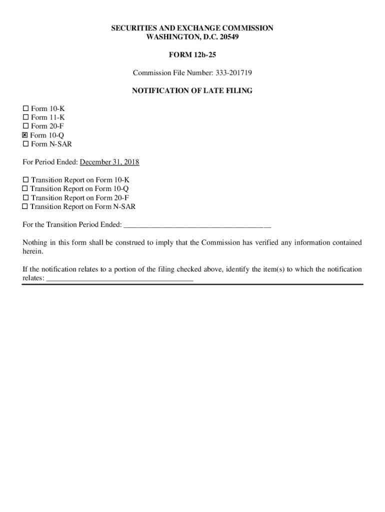 SECURITIES AND EXCHANGE COMMISSION WASHINGTON, D.C. 20549 FORM 12b25 Commission File Number: 333201719 NOTIFICATION OF LATE FILING Form 10K Form 11K Form 20F Form 10Q Form NEAR For Period Ended: December