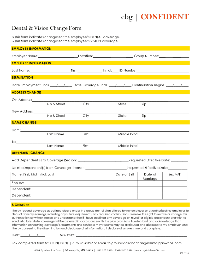 CBG CONFIDENT Dental & Vision Change Form This form indicates changes for the employees DENTAL coverage. This form indicates changes for the employees VISION coverage. EMPLOYER INFORMATION Employer