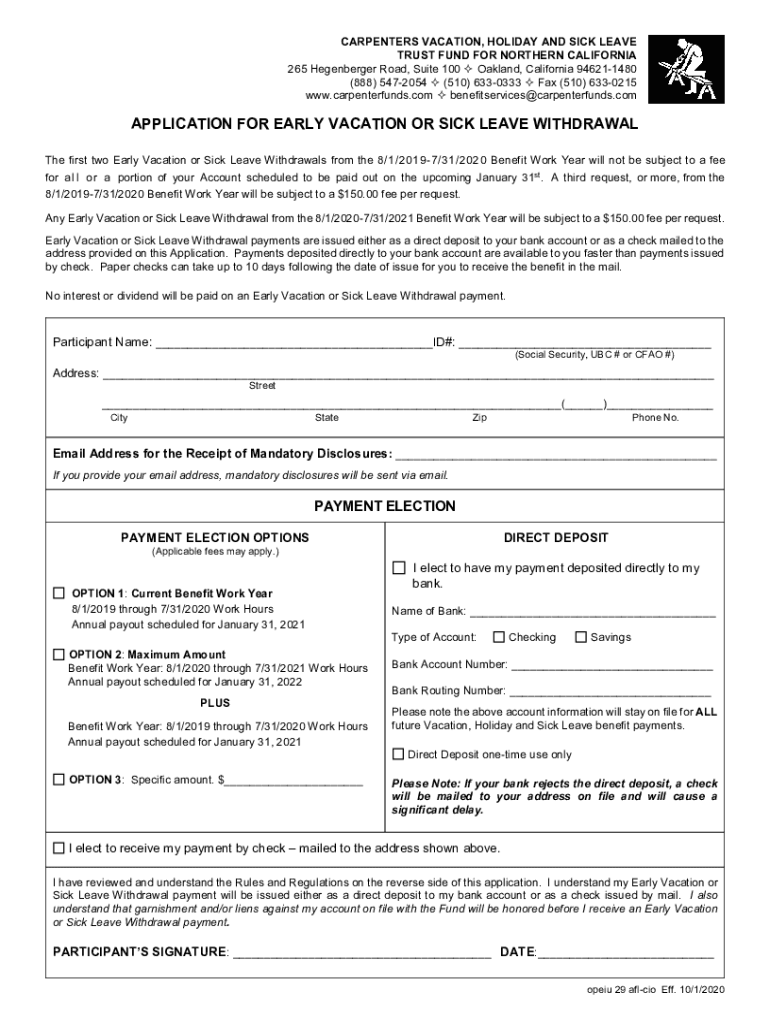 CARPENTERS VACATION, HOLIDAY AND SICK LEAVE TRUST FUND FOR NORTHERN CALIFORNIA 265 Vegeburger Road, Suite 100 Oakland, California 946211480 (888) 5472054 (510) 6330333 Fax (510) 6330215 www.carpenterfunds.com