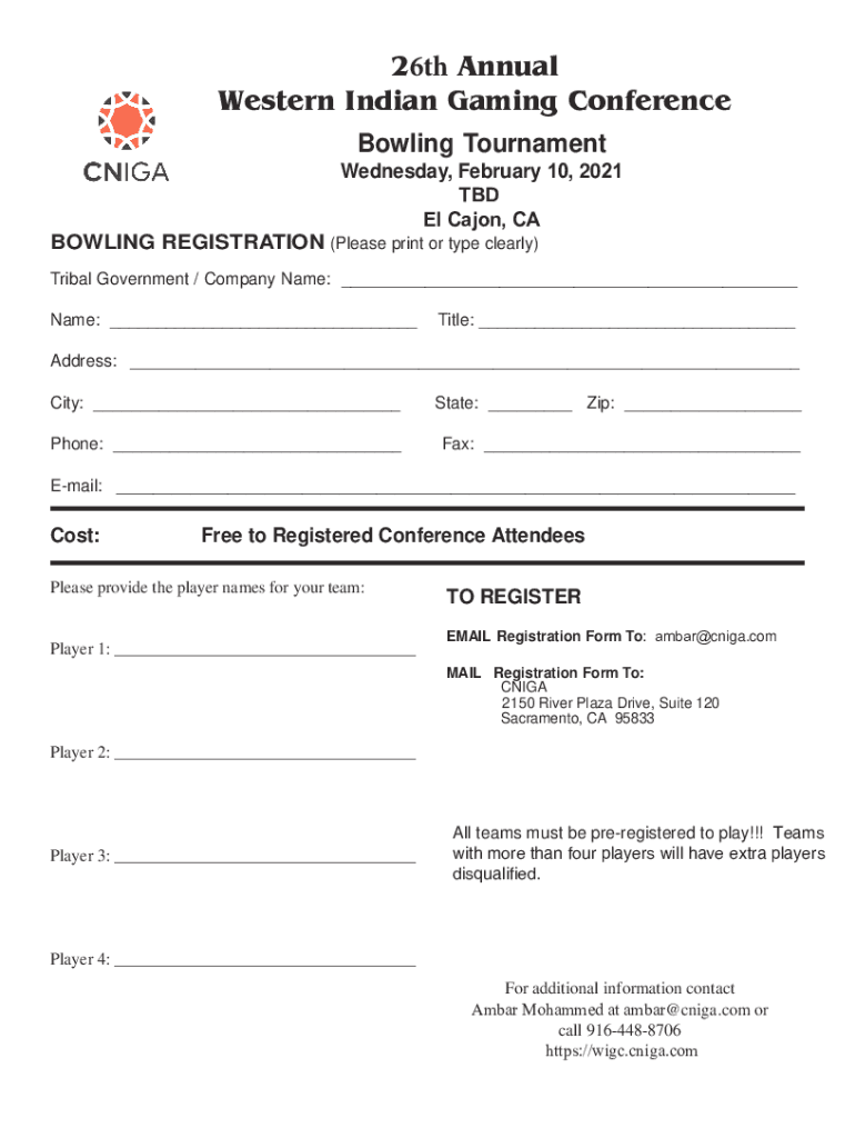 26th Annual Western Indian Gaming Conference Bowling Tournament Wednesday, February 10, 2021, TBD El Cajon, CA BOWLING REGISTRATION (Please print or type clearly) Tribal Government / Company Name: