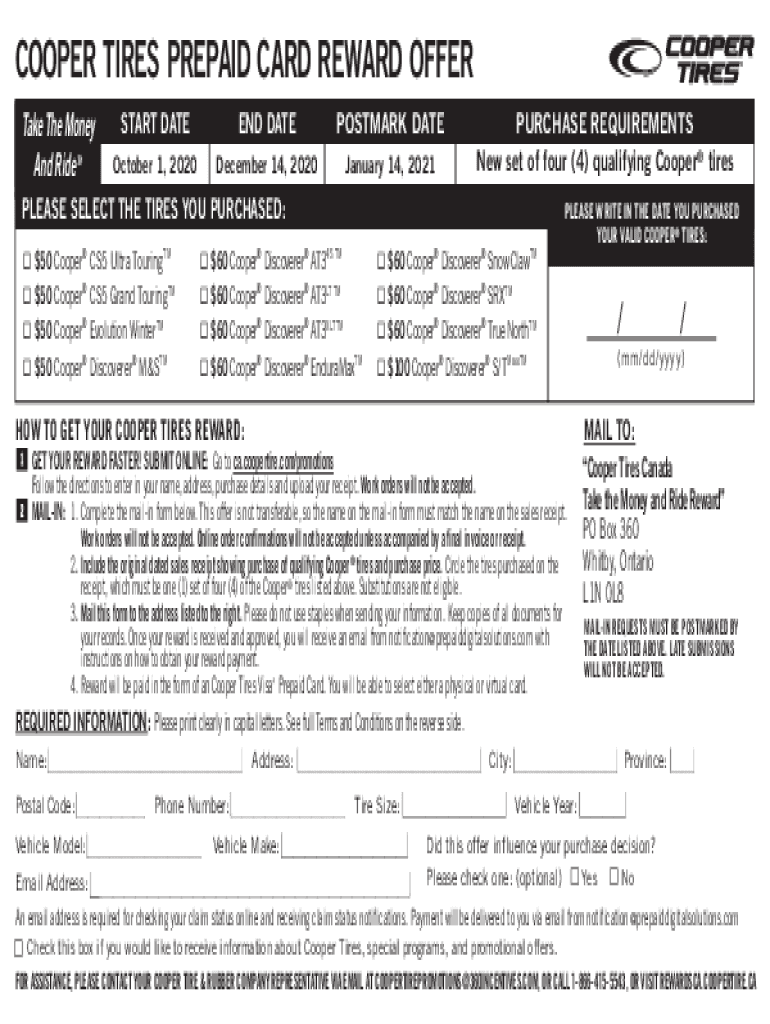 COOPER TIRES PREPAID CARD REWARD OFFER Take The Money And Ride START DATE END DATEPOSTMARK DATE October 1, 2020December 14, 2020January 14, 2021PURCHASE REQUIREMENTS New set of four (4) qualifying