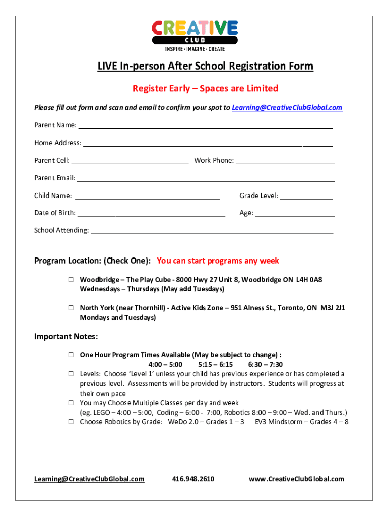 LIVE Unperson After School Registration Form Register Early Spaces are Limited Please fill out form and scan and email to confirm your spot to Learning CreativeClubGlobal.com Parent Name: Home Address: