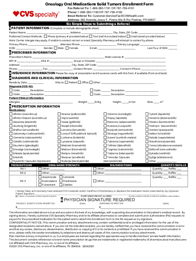 Oncology Oral Medications Solid Tumors Enrollment Format Referral To: 18882801191 OR 7877594161 Phone: 18882801190 OR 7877594162 Email Referral To: Customer. Serviceman CVSHealth.com Address: 280