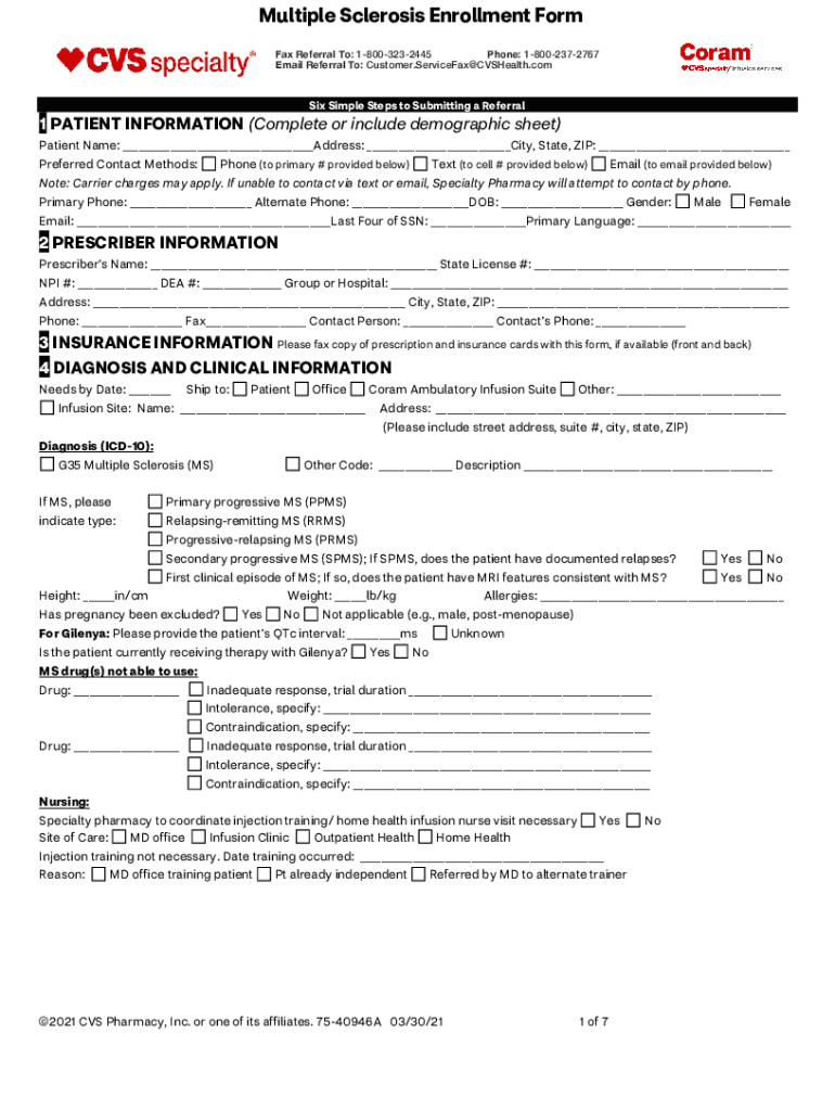 Multiple Sclerosis Enrollment Form Phone: 18002372767 Fax Referral To: 18003232445 Email Referral To: Customer. Serviceman Health. Comic Simple Steps to Submitting a Referral1 PATIENT INFORMATION